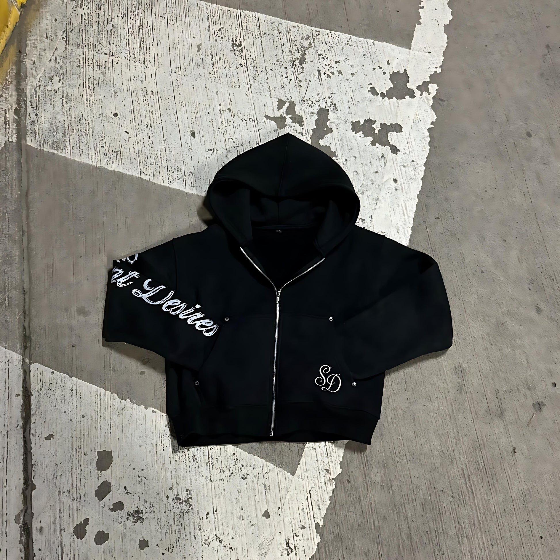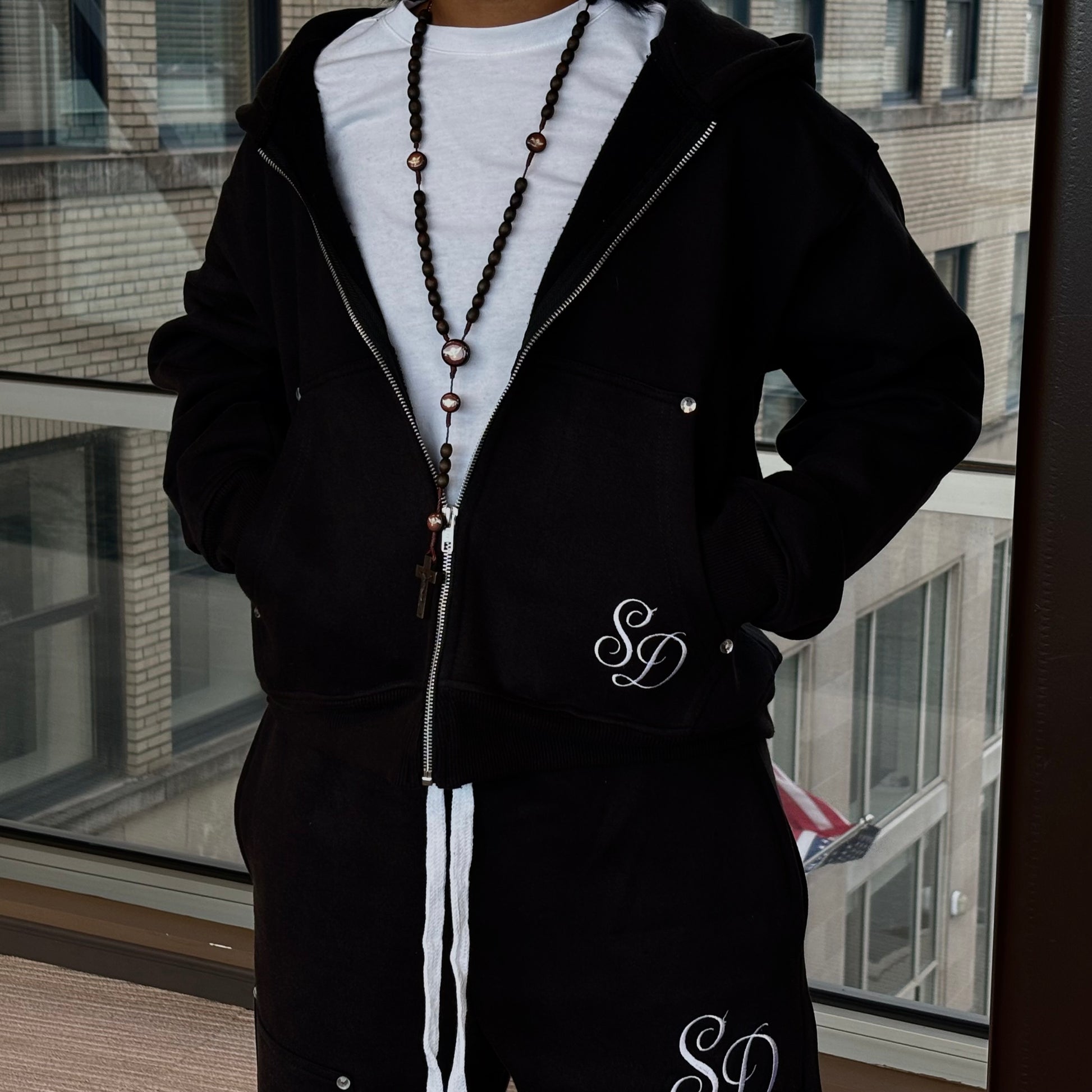 The Haze Hoodie – A premium black hoodie crafted from 100% cotton fleece with a heavyweight 400 GSM feel. Detailed with rhinestones and embroidered logos for a clean, standout look.